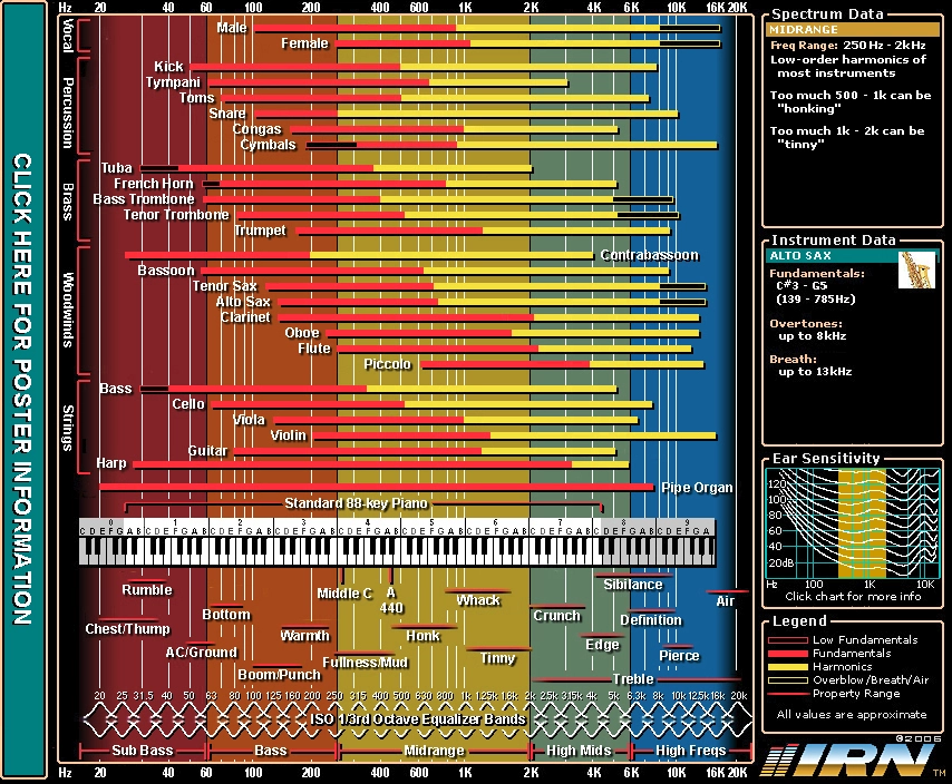 An example of reference material that might be suitable for production is frequency charts. Frequency charts show the frequency range of common instruments and sounds sources, for example the female voice, of the bassoon. It will help you ballpark a good starting point for the equalisation. It will also help to point out where some of the muddiness in a mix may be rooted from. It will show the overlaps between instruments in a specific frequency range, that might be smudging each other out. This reference is more suitable for beginners, but when getting into advanced mixing with countless instruments, this becomes a lot less helpful.